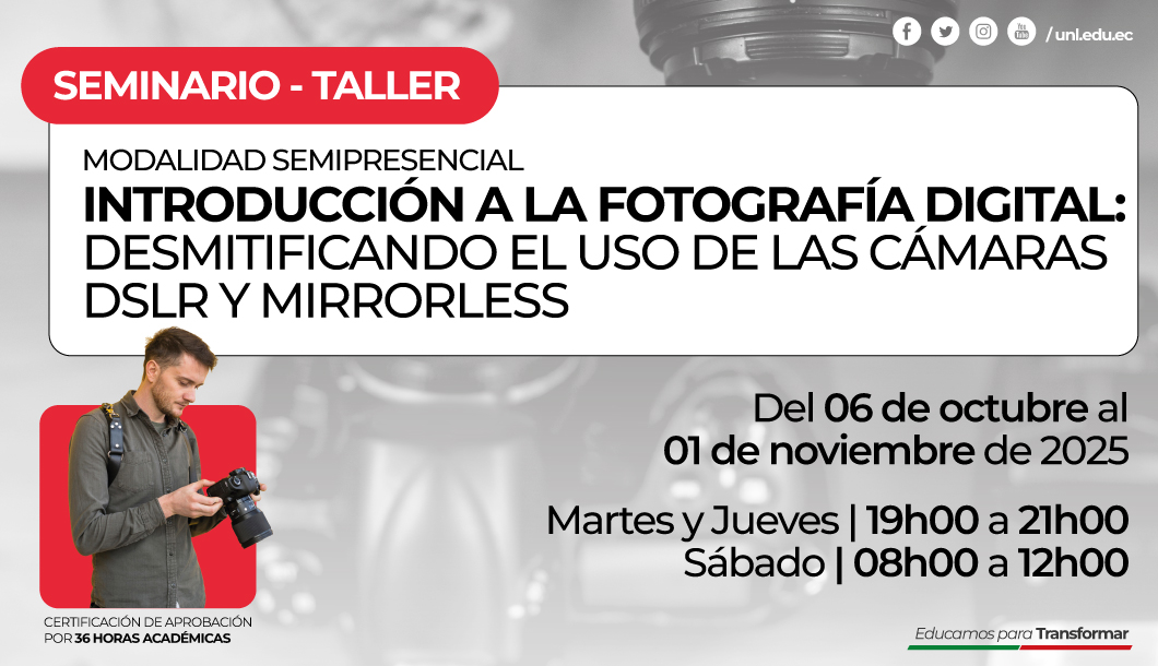 El curso “Introducción a la Fotografía Digital: Desmitificando el uso de las Cámaras DSLR y Mirrorless” está dirigido a estudiantes, docentes de artes y público interesado en la fotografía. Su objetivo es reducir la brecha entre el acceso a cámaras digitales y el dominio de sus funciones, brindando a los participantes competencias técnicas y creativas en el uso de la exposición (apertura, velocidad e ISO), balance de blancos, composición y manejo de la luz.