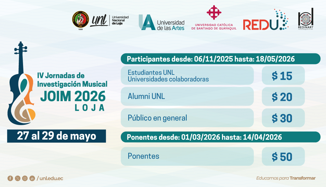 Las cuartas Jornadas de Investigación Musical de la Universidad Nacional de Loja JOIM 2026 están constituidas por un conjunto de actividades de divulgación, formativas, académicas y artísticas, entre las que se enumeran conferencias, clases magistrales, simposios temáticos y recitales. Cada una de estas actividades será desarrollada por especialistas en las distintas áreas y coordinadas por la carrera de Artes Musicales, el Grupo de Investigación y Producción artística G-IPA-UNL, la Dirección de Investigación, la Coordinación de Vinculación con la Sociedad de la UNL y la Red de Investigación en Artes (REDINART). Como eje central del evento se plantea la socialización de los resultados de procesos investigativos con alta significación en el ámbito de la música lojana, ecuatoriana y latinoamericana. Asimismo, se propone una instancia de formación sobre recursos y métodos pertinentes para la investigación musical con el fin de incentivar la producción científica en esta área del saber y atender necesidades imperantes en el circuito local, nacional y latinoamericano. Como en las tres ediciones previas, realizadas en 2020, 2022 y 2024, este encuentro busca establecer y fortalecer los vínculos profesionales e institucionales entre los diferentes actores involucrados.