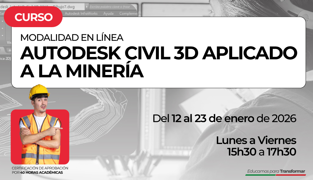 En un entorno donde la industria minera demanda procesos cada vez más precisos y eficientes, la actualización en el uso de herramientas tecnológicas avanzadas se vuelve indispensable. Actualmente, muchos profesionales del sector continúan aplicando metodologías tradicionales que limitan la exactitud en el modelamiento del terreno, el cálculo de volúmenes y la gestión integral de obras mineras. Esta brecha tecnológica puede generar retrasos, incrementar los costos operativos y dificultar la toma de decisiones estratégicas. El curso “Civil 3D aplicado a la minería” surge como una respuesta a esta necesidad, brindando a los participantes la oportunidad de fortalecer sus capacidades en el manejo de uno de los softwares más utilizados a nivel internacional para el diseño y planificación de proyectos mineros. Mediante un enfoque eminentemente práctico, el programa aborda la creación de modelos digitales de terreno, el diseño de plataformas y accesos, así como la optimización de cálculos y la visualización de obras. De esta manera, contribuye al cierre de brechas de conocimiento y asegura la adopción de metodologías alineadas a las exigencias actuales de la industria. La actualización en Civil 3D permite a ingenieros, geólogos y técnicos mineros mejorar significativamente su desempeño profesional, incrementando la productividad, reduciendo errores de diseño y promoviendo una gestión más sostenible y eficiente de los recursos. Este curso, enmarcado en la Educación Continua, impulsa la formación de profesionales competitivos y preparados para enfrentar los desafíos de la minería moderna.